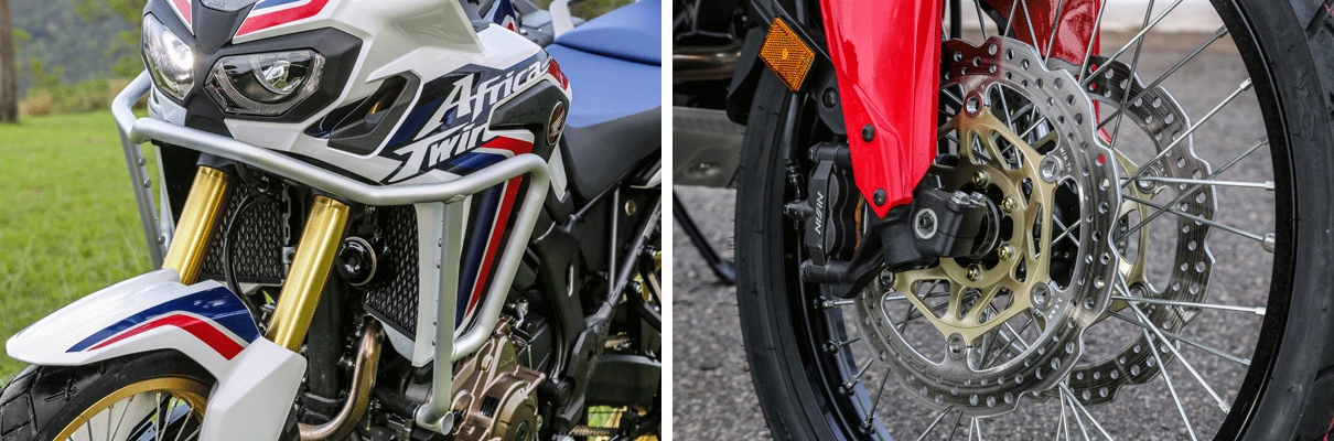El freno delantero posee disco doble con 310 mm de diámetro, ABS y pinzas radiales de 4 pistones, mientras que el trasero incluye disco simple de 256mm de diámetro y ABS (con opción de desconexión). Diseñada para enfrentar terrenos de on y off road, cuenta con una altura libre del suelo de 250mm.