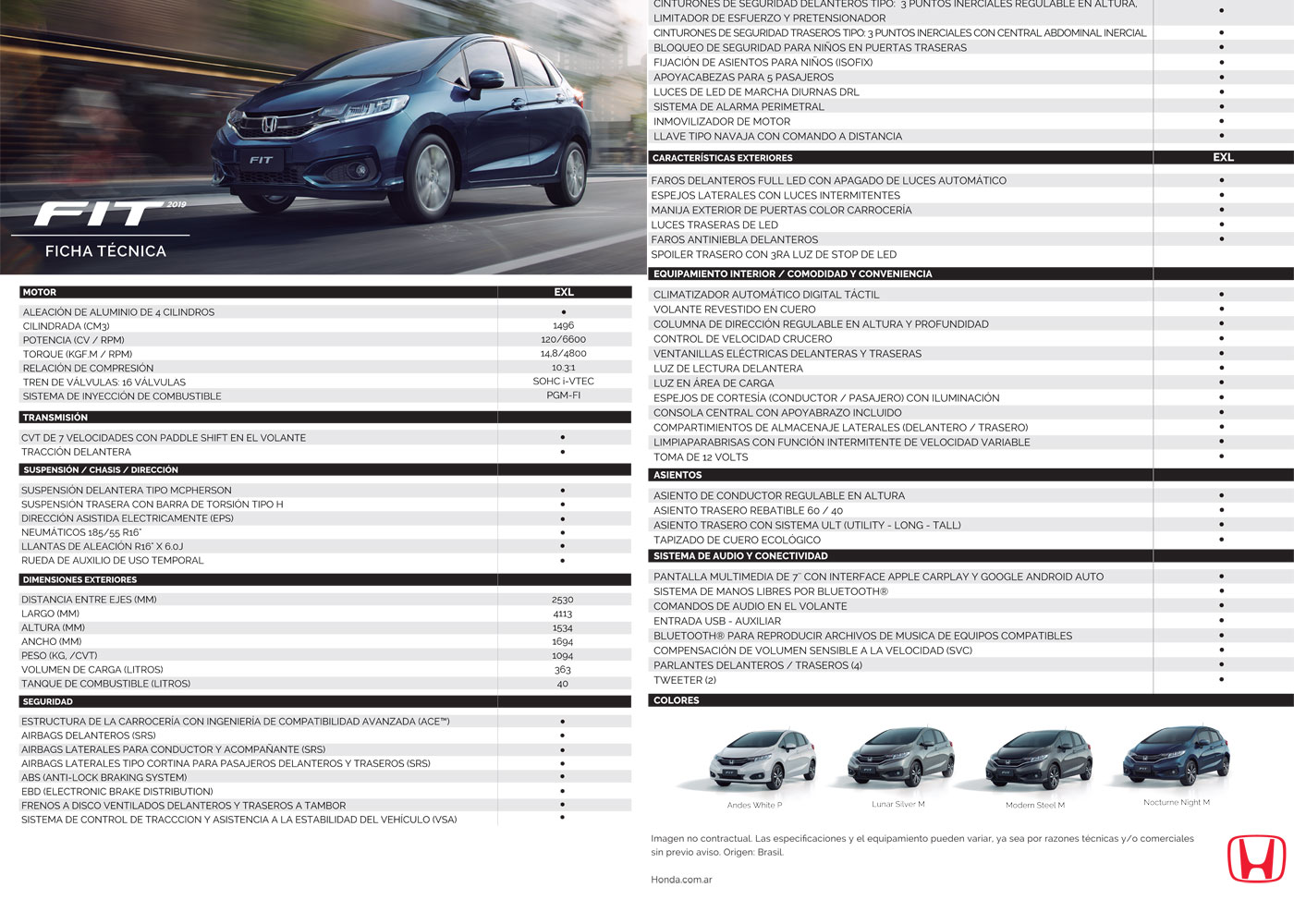 Otro punto importante es que cambió su origen: ya no llega importado desde México, sino desde Brasil, lo que trajo aparejado también una modificación en su mecánica como ampliaremos en dicho ítem. El Honda Fit 2019 estará disponible en todos los concesionarios oficiales a partir del 6 de julio y estas son sus características más importantes: