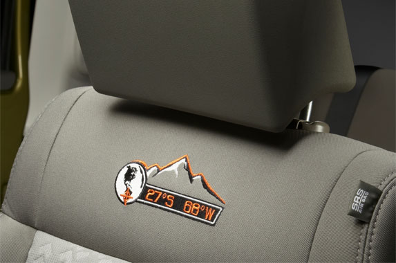 El Mountain, viene equipado con llantas de Aluminio de 17 pulgadas, parrilla y apliques en el paragolpe de color Mineral Gray brillante; estribos laterales tubulares; cubiertas de 32 pulgadas; grillas protectoras de faros traseros de color negro y la tapa de combustible de Mopar.