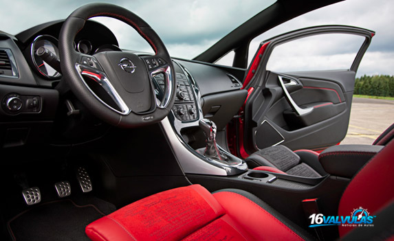 El pequeño volante deportivo forrado en cuero tiene inserciones metálicas. En el tablero, el interior continúa presentando los típicos motivos de la forma de “ala” y forma de “álabe” característicos de Opel. En esta ejecución, la forma de “álabe” se expresa en detalles como la forma de las manillas cromadas de las puertas y el acabado de la palanca de cambios.