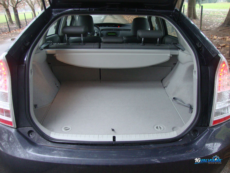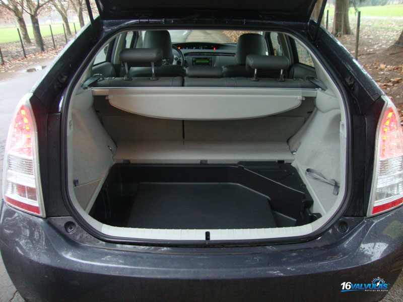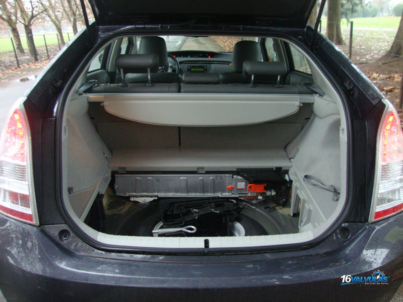El baul posee una capacidad de carga de 445 dm3, encontrándose debajo del piso un compartimiento para colocar objetos de tamaño reducido. Debajo del mismo si situa la cubierta de auxilio con las herramientas necesarias para el reemplazo de la misma así como el gancho para remolque y delante de ella la batería de Niquel con 28 módulos y 168 celdas que alimenta el motor eléctrico del Toyota Prius. Si observamos las partes naranjas situadas sobre la bateria corresponden a los contactos por los que se aplican tensión.