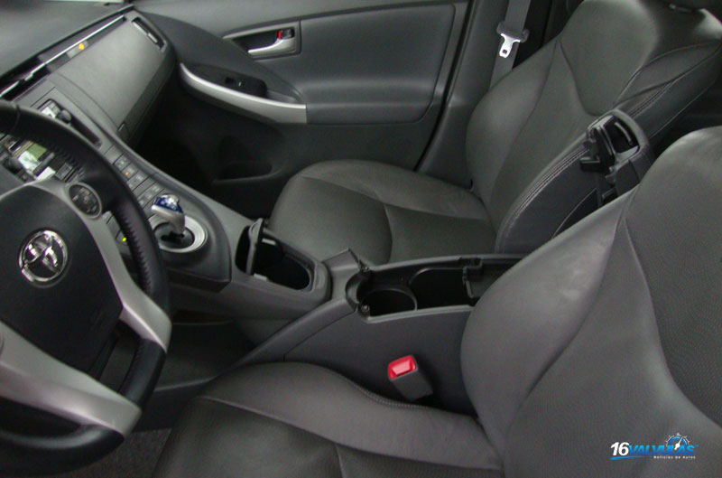 El interior del Toyota Prius cuenta con elementos que le confieren un interior con elegancia y tecnología. El Toyota Prius puede transportar perfectamente a 5 ocupantes con buena apertura de sus puertas tanto para las plazas delanteras como para las traseras. La altura interior, la separación de asientos y el ancho de la carrocería proporcionan comodidad a sus ocupantes. Las butacas delanteras se encuentran tapizadas en cuero y son cómodas a pesar de no tener una sujeción lateral importante, contando con sus correspondien apoyacabezas regulables en altura.