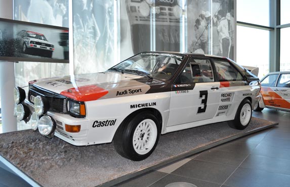 Acontinuación se encuentra el Audi Rally Quattro A2 similar al que condujo Michele Mouton, con un motor de 5 cilindros y 360 HP que desarrollaba una velocidad de 255 km/hora. La piloto francesa que causó sensación en el Rally de San Remo por ser la primera conductora femenina en ganar una competencia por el Campeonato Mundial de Rally.